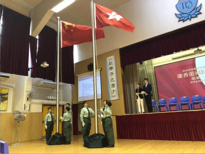 五星红旗飘扬,特区区旗招展。7月1日9时,沙田各界庆祝香港回归祖国23周年庆典在曾璧山中学大礼堂举行。