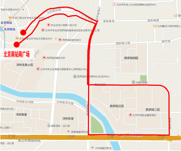 调整后首末站:北京南站南广场-北京南站南广场路由:由北京南站南广场发出,经北京南站路、马家堡东路至西罗园路西口,沿专18路原路由绕行西罗园社区后,沿马家堡东路向北,经北京南站路至北京南站南广场。中途设站:北京南站南广场、四路通、西罗园路西口、西罗园路、西罗园路南口、木樨园桥西、洋桥北、四路通、北京南站南广场。营业时间:平日6:00-9:10、16:00-19:10,节假日9:00-16:00。