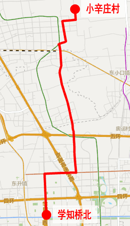 中途设站:小辛庄村、小辛庄、小辛庄西、龙锦苑东二区北门、霍营、上坡佳园西门、霍营乡、华龙苑南里北门、黄平路口南(小辛庄村→学知桥北方向)、黄土店火车站、科星路南口(学知桥北→小辛庄村方向)、枫丹丽舍小区东、西小口路口北、西小口路口南、黑泉路南口、宝盛里小区、龙岗路东口、地铁林萃桥站、京师园北门、倚林佳园东门、澳林春天小区、林萃路口北、奥运村西、北沙滩桥东、北沙滩桥西、二里庄北口、中国农业大学东校区、学院路北口、成府路口南、北京航空航天大学、学知桥北。