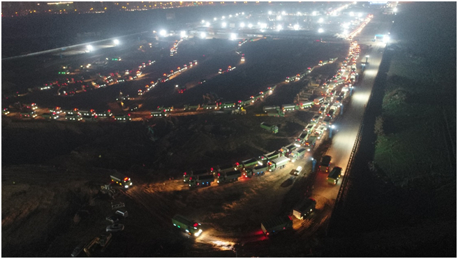 这是2018年春节前的一个夜晚,透过无人机的视角从空中俯瞰,灞河两岸的西安奥体中心和国际会展中心工地上桩基林立,灯火通明,土方开挖热火朝天,数百辆渣土车同时作业,川流不息的车辆长龙见头不见尾,车灯照亮了严冬沉睡的夜空。