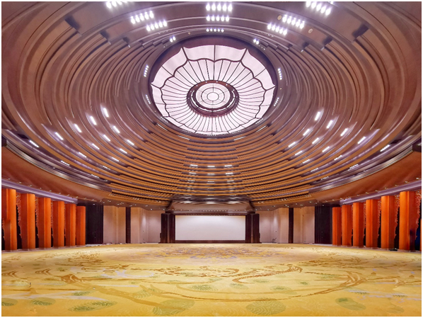 西安三中心项目涉及多个高大空间营造。图为国际会议中心圆桌会议厅,左右各九根立柱支撑起九层穹顶,整厅横跨48米,层高18米