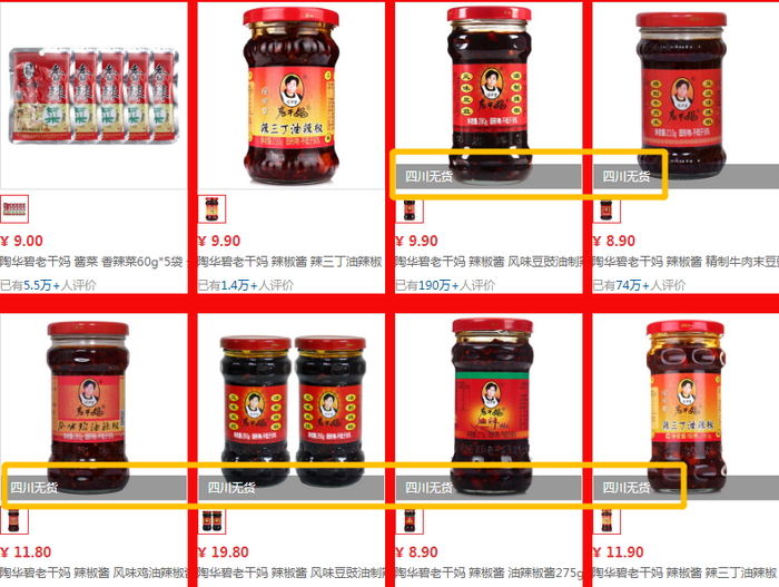 每经小编注意到,在老干妈京东自营旗舰店上,大部分老干妈辣椒酱已显示售罄,目前为无货状态,即便有货的产品也显示需要“2-6天调货”。
