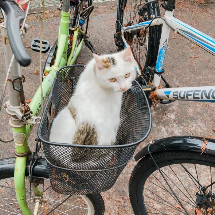 45.在废弃自行车的篮子里找到它们舒适的小窝,有时候觉得在师大做只猫猫可真幸福。