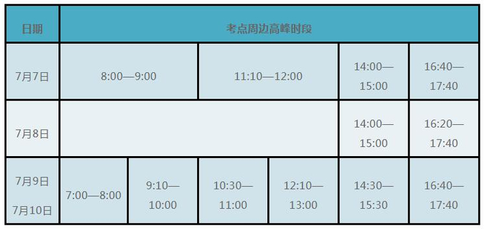预计7月7日8:00-9:00、11:10-12:00、14:00-15:00、16:40-17:40四个时段,7月8日14:00-15:00、16:20-17:40,两个时段,7月9日和7月10日7:00-8:00、9:10-10:00、10:30-11:00、12:10-13:00、14:30-15:30、16:40-17:40六个时段考点周边道路通行压力较大。