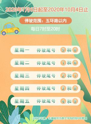 7月6日至10月4日,星期一至星期五限行机动车车牌尾号分别为:5和0、1和6、2和7、3和8、4和9。