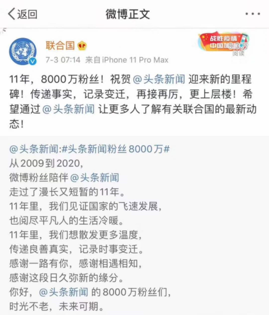 头条新闻微博粉丝破8000万,@联合国 发来贺电!