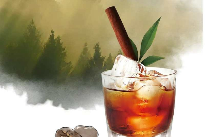 仲夏夜:加入国窖1573酒15毫升、甘露咖啡力娇15毫升和布朗尼口味糖浆10毫升,然后加入立顿红茶茶汤45毫升混合均匀,最后用肉桂装饰。咖啡与红茶,白酒与肉桂,神秘又带着甜香的味道,让人无限遐想。