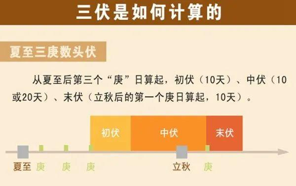 中国天文学会会员、天津市天文学会理事史志成介绍说,传统的推算方法规定,夏至后的第三个庚日起为“初伏”,从夏至后的第四个庚日起为“中伏”,立秋后的第一个庚日起为“末伏”,总称为“三伏”。由于夏至与第一个庚日之间的天数几乎每年都不一样,所以与“三庚”的天数也不是固定的。