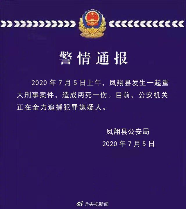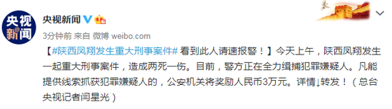 今天上午,陕西凤翔发生一起重大刑事案件,造成两死一伤。目前,警方正在全力缉捕犯罪嫌疑人。凡能提供线索抓获犯罪嫌疑人的,公安机关将奖励人民币3万元。详情↓转发!(总台央视记者闫星光)