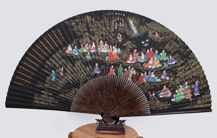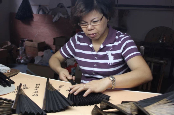 至于桑纸则是古代用于制作纸伞的原料,在制作黑纸扇的过程中,需要用松榆木烧火,再将烟凝结后的灰尘扑在纸上,以此达到“染色”效果。最后再用专门的胶水黏合扇骨、扇面,达到“一把扇子半把伞”的效果,使得过去的折扇在美观之余,也具备一定的实用性。