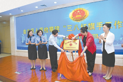 图①:6月4日,广西壮族自治区检察院与自治区妇联联合创建的“三八红旗手工作室”正式投入使用。该平台将发挥妇女儿童维权岗作用,大力推进反家暴工作。记者邓铁军摄