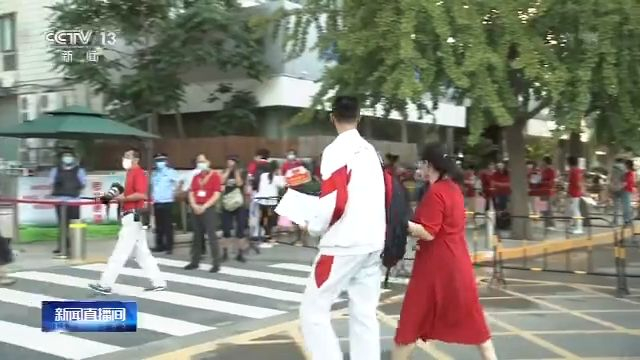 上午7时30分,北京人大附中考点已经有考生们陆陆续续抵达考点,经过测温后进入考点的第一道门。同时,很多家长跟考生简单拥抱后自觉得即停即走。在校门口两侧,老师们身穿红色T恤为考生们加油打气。