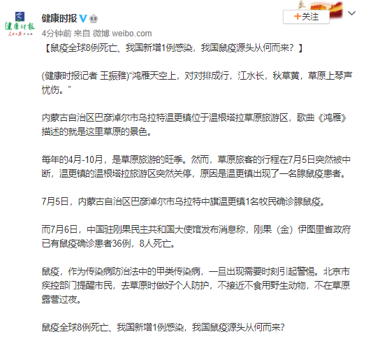 7月5日,内蒙古自治区巴彦淖尔市乌拉特中旗温更镇1名牧民确诊腺鼠疫。