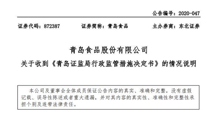 上述行为违反了《非上市公众公司监督管理办法》(证监会令第96号)第二十条的相关规定,青岛证监局决定对青岛食品采取责令公开说明的行政监管措施,并记入证券期货市场诚信档案。