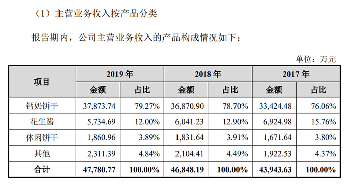 此外,青岛食品的主营业务中,钙奶饼干仍然一家独大。招股书显示,2017年-2019年,钙奶饼干产品销售额分别为3.34亿元、3.68亿元、3.87亿元,占比分别为76.06%、78.7%、79.27%,贡献的毛利占主营业务毛利的比例分别为93.48%、93.10%、92.94%。