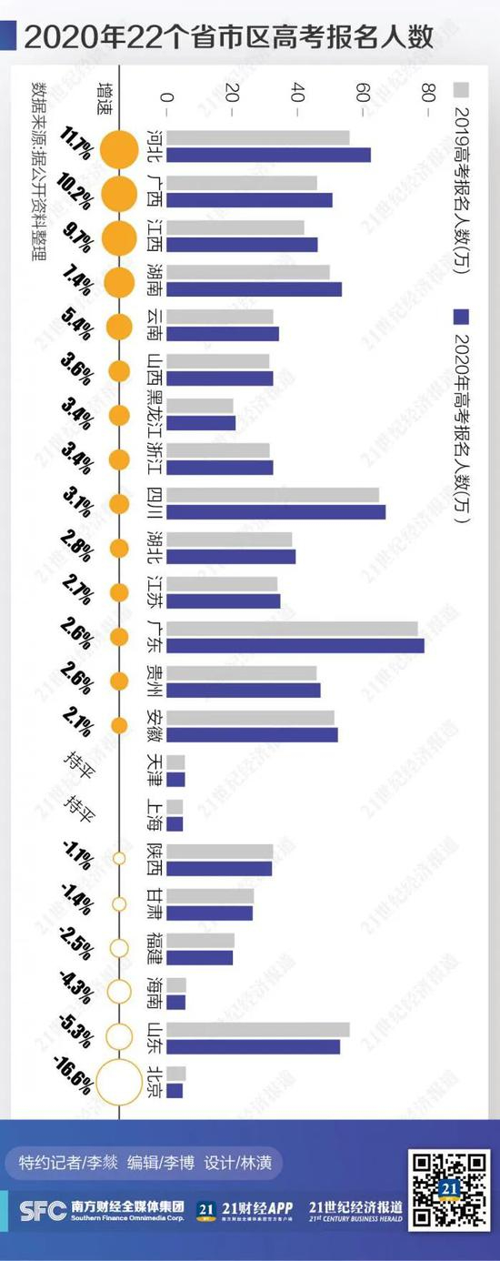 2020年我国高考报名人数达1071万,创下历史新高。从已公布的22个省市区的数据来看,河北、广西、江西、湖南4地合计增加了19万人,几乎占到全国总增量40万的半壁江山。