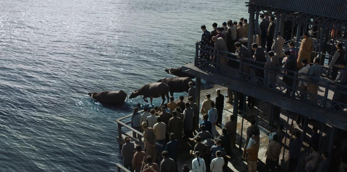 其次是制作层面。《河神2》是一部民国戏,但它规避了大多数民国剧的一个共性问题:把民国剧拍成了时代背景模糊的民国时装剧。《河神2》在服化道层面上,为观众还原了一幅充满“津味”的民国市井画。龙王庙、点烟辩冤、九牛下水引河妖、鬼市、京剧戏院等场景的布置,充满民俗文化细节,有着浓厚的地域色彩,扎扎实实地还原了一个老天津。