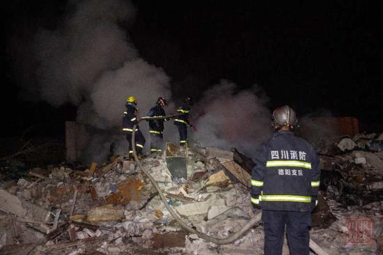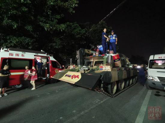 对此次燃爆事故,消防启动了一次较大规模的救援——共调集包括德阳市10个消防站104人、成都支队6车27人、绵阳支队12车53人以及训保支队1发电车2人等在内救援力量,并派出了四川仅有的两台消防坦克之一,而这是我省消防坦克第一次出现火灾救援现场。