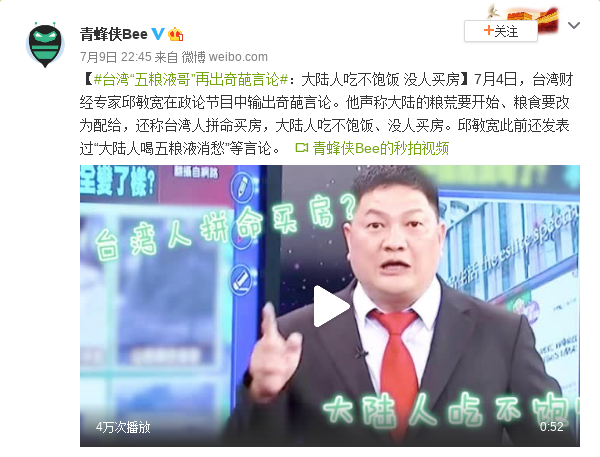 7月4日,台湾财经专家邱敏宽在政论节目中输出奇葩言论。他声称大陆的粮荒要开始、粮食要改为配给,还称台湾人拼命买房,大陆人吃不饱饭、没人买房。邱敏宽此前还发表过“大陆人喝五粮液消愁”等言论。