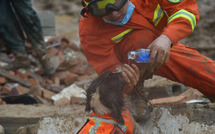 7月8日,湖北省黄冈市黄梅县大河镇袁山村,消防员给搜救犬喂水。受访者供图