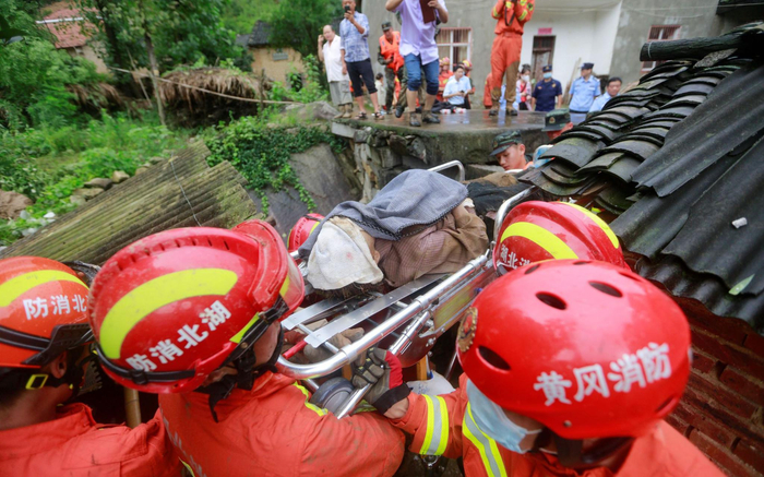 7月8日,湖北省黄冈市黄梅县大河镇袁山村,消防员救出一名生命体征平稳的81岁老人。受访者供图