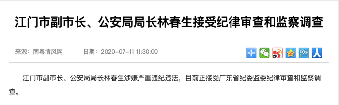 据广东省纪委监委7月11日消息,江门市副市长、公安局局长林春生被查。
