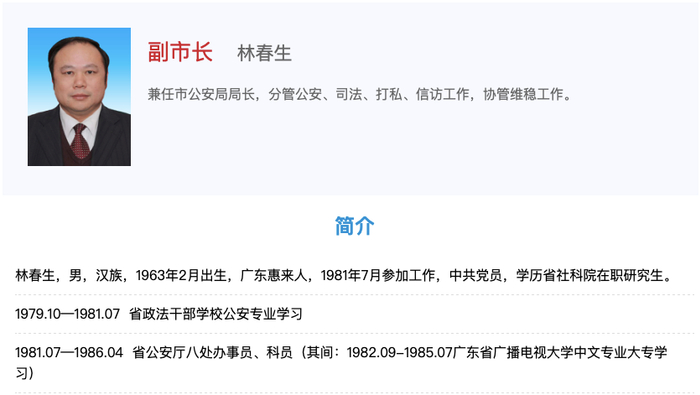 政知君注意到,林春生从毕业后就到了广东省公安厅,在公安系统工作了近40年。