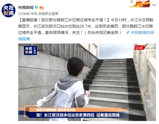 今日13时,长江水文网数据显示,长江武汉段汉口站水位到达28.7米,达到历史第四,部分路段江水已高过城市主干道。(总台央视记者金珠)