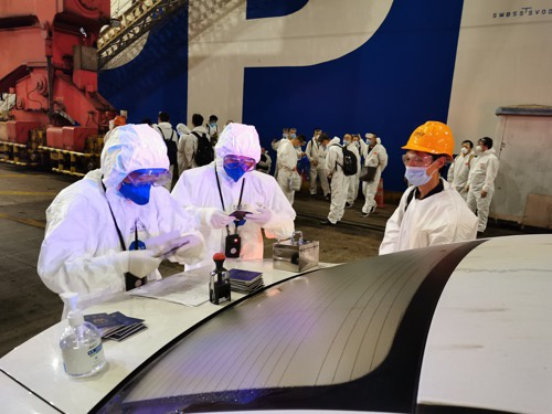 洋山边检站严格落实船舶航行轨迹核查和船员行程排查措施,加强对船员航海期间健康日志的检查,严防疫情从境外输入。由于本航次中远海运“室女座”轮14天内未经停过疫区国家港口,在船船员均无涉疫症状。昨天凌晨,船舶靠泊洋山港后,海关进行入境检疫并确认情况正常,14名已经完成隔离观察的船员先行登轮复工。随后,洋山边检站将查验窗口前移至船舶梯口,为包括海外互换的8名船员在内的20名离船船员,办理入境边检手续,无缝对接船员调换封闭式转运通道。之后,全体入境船员由专车送往集中隔离点。