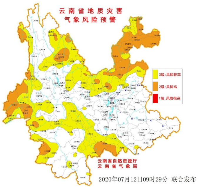 云南省气象局、云南省自然资源厅2020年7月12日16时30分继续联合发布地质灾害气象风险预警:受持续降雨影响,预计未来24小时,昭通大部、曲靖北部、昆明北部、楚雄北部、丽江西南部、怒江北部、保山西北部、德宏西部、临沧西部、普洱西南部、红河西南部地质灾害气象风险等级为Ⅱ级(风险高),易出现滑坡、泥石流和崩塌等地质灾害,请注意防御。