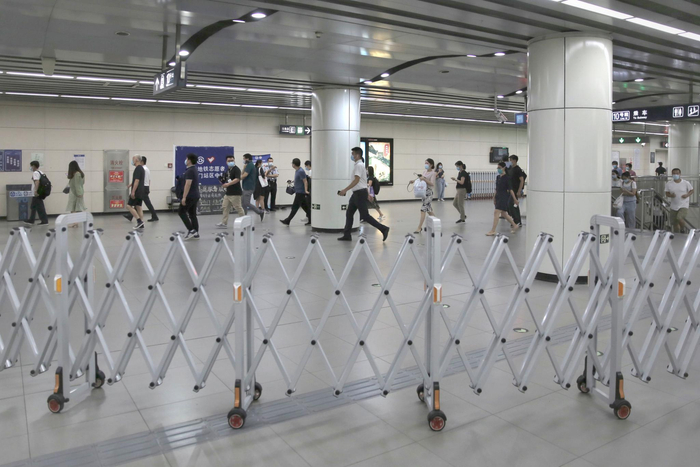 7月14日,新京报记者在四惠地铁站看到,原设定于一号线与八通线出入口之间的限流栏已全部撤除,仅保留了用于隔离已安检区与非安检区的围栏,撤下来的护栏被集中堆放在站内一角。