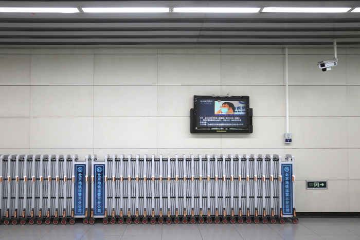 地铁芍药居站,客流较少时,可移动伸缩围栏被摆放在靠墙位置。新京报记者 郑新洽 摄