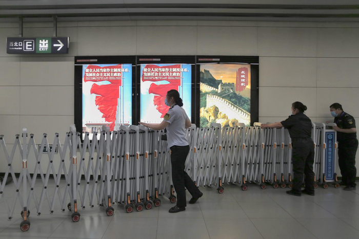 地铁芍药居站,大客流时段开始前,地铁工作人员使用可移动伸缩护栏对乘客进行分流。新京报记者 郑新洽 摄