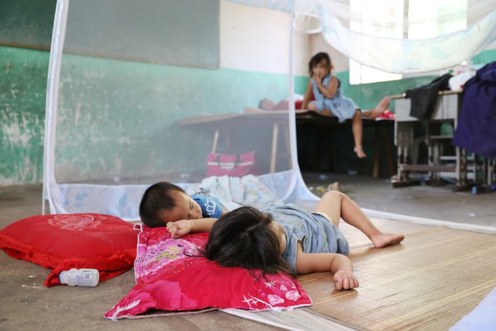 △ 7月14日,龙口小学安置点,李女士一家七口人暂时住在这里。中午,孩子们在午休。摄影/新京报记者王飞