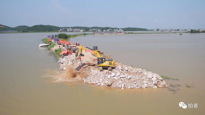 △ 截至14日下午16时,鄱阳县昌洲乡中洲圩已累计填筑土方5076立方米,长约170米的决口已进占14米。摄影/通讯员谭明裕