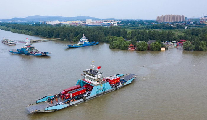 △ 7月14日,九江市江新洲渡口,大批救援车辆由新港镇搭乘渡轮前往江洲镇,据介绍是为了应对之后可能会到来的洪峰。摄影/新京报记者陶冉