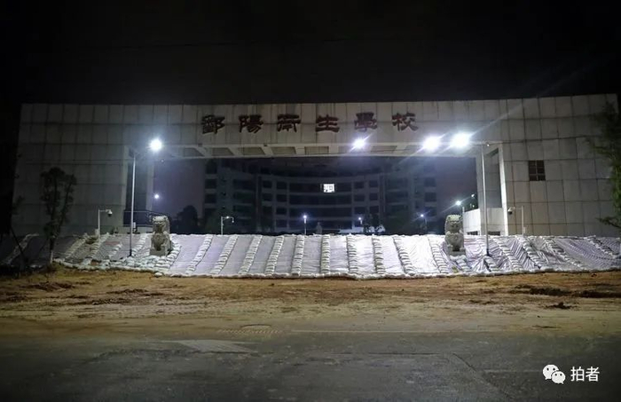 △ 7月14日凌晨,保卫鄱阳县的防洪“第二道防线”从鄱阳卫生学校门前经过。受持续强降雨和上游来水叠加影响,7月12日零时,鄱阳湖水位突破有水文记录以来的历史极值。13日傍晚,鄱阳站水位仍超历史最高记录4厘米。摄影/新京报记者王飞