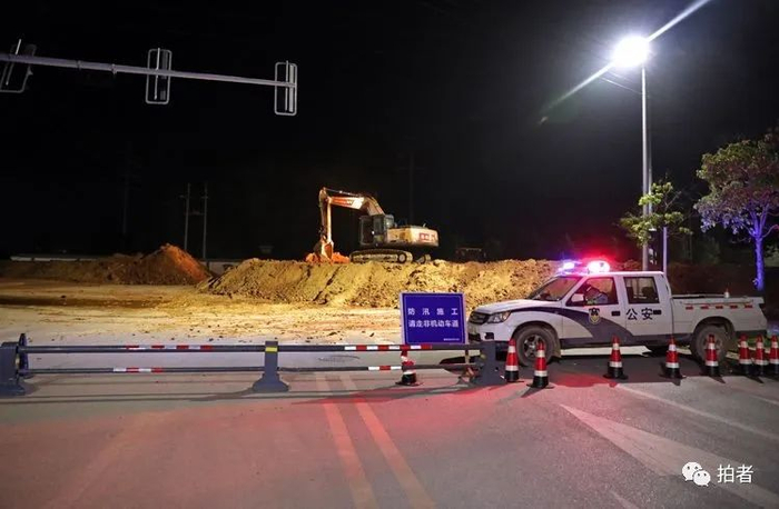 △ 7月14日凌晨,鄱阳县城,防洪“第二道防线”上一台挖掘机正在施工,路口有警车值守。据鄱阳县政府官网消息,鄱阳县已发动全部劳动力上圩抢险,执行24小时值班、不间断巡堤制度。摄影/新京报记者王飞