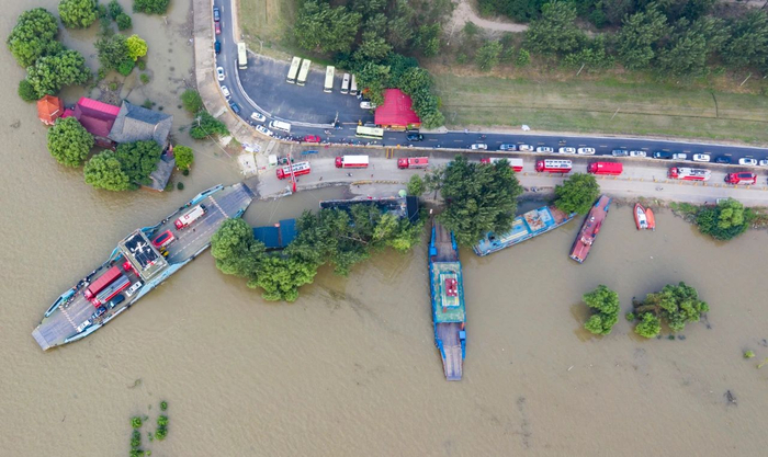 △ 7月14日,九江市江新洲渡口,撤离江洲镇的车流(图左)。摄影/新京报记者陶冉