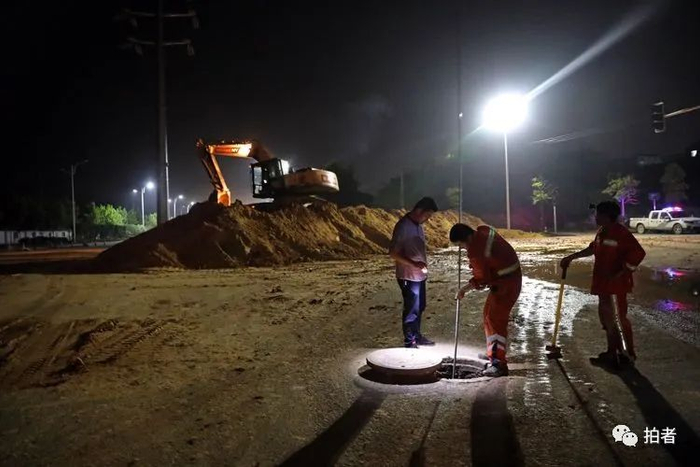 △ 7月14日凌晨,鄱阳县城,抢险人员检查下水管道。摄影/新京报记者王飞