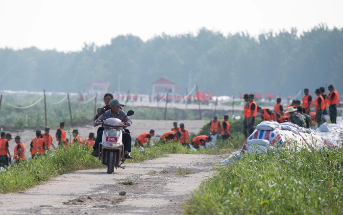 △ 7月14日,九江市江洲镇,即将撤离的村民回头看正在加固堤坝的武警战士。摄影/新京报记者陶冉