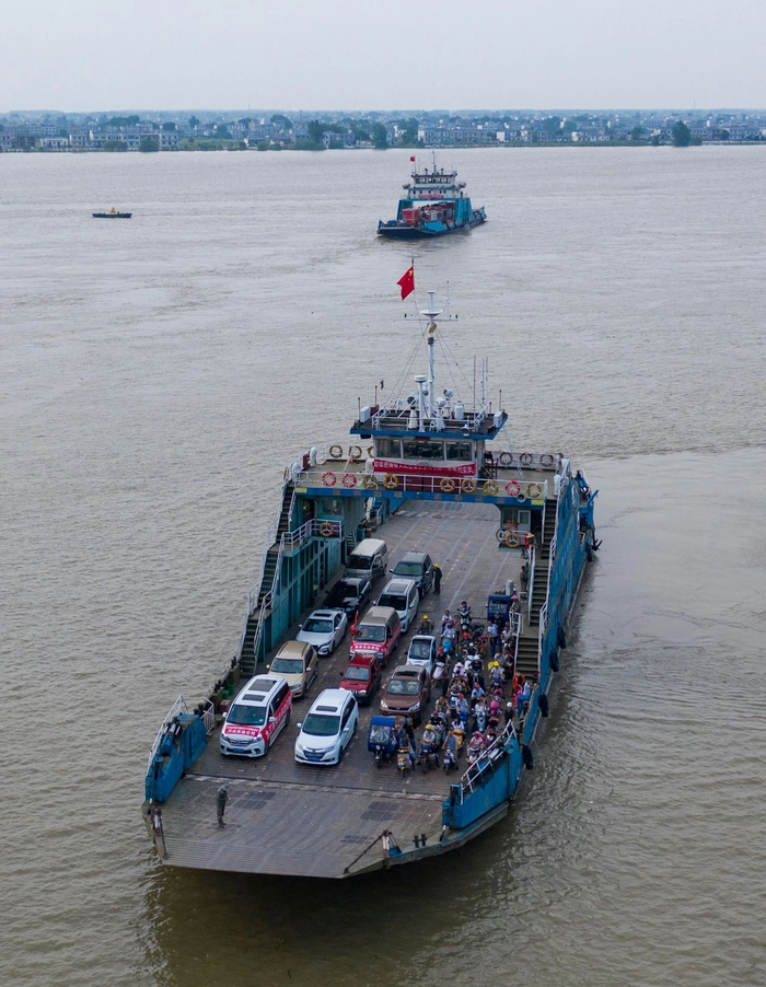 新京报记者了解到,乘坐渡轮是江洲镇上居民出行的唯一方式,渡口运行的渡轮一艘船可以运载50辆小型汽车和300位乘客,单趟航行时间约为20分钟,撤离通知发出后,镇上居民有序撤离,轮渡船只延长运营时间运送撤离人员车辆。