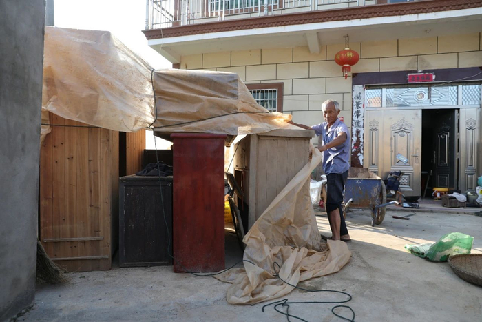 △ 7月14日,龙口村下属自然村邹家村,70岁的邹先生将从洪水中抢出来的家具摆在儿子家院中晾晒,为防止雨水打湿,他还为其加盖上了一层塑料布。摄影/新京报记者王飞