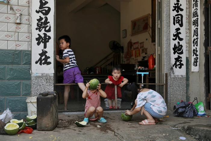 △ 7月14日,藕塘村,小朋友们在家门前吃西瓜。摄影/新京报记者王飞