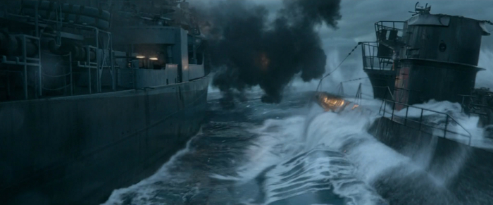 影片中“灰猎犬号”与德军潜艇在海面上肉搏战镜头。