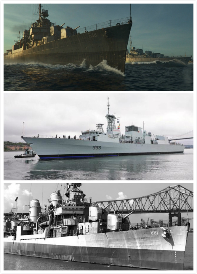 自上而下分别是影片中的“灰猎犬号”、加拿大皇家海军“蒙特利尔”号护卫舰以及美国驱逐舰“基德”号。