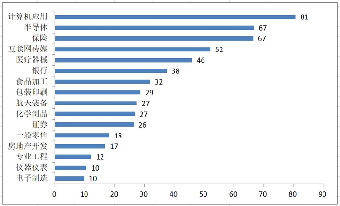 若从减持市值来看,被计划减持市值超过10亿元的行业有:计算机应用81亿元、半导体67亿元、保险67亿元、互联网传媒52亿元和医疗器械46亿元等16个。