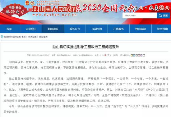 14日,独山县在县政府网站发布《独山县切实推进形象工程政绩工程问题整改》,对舆论作出回应: