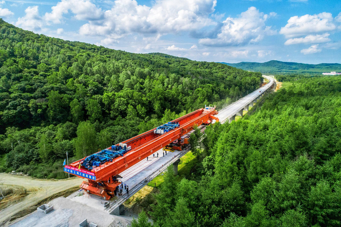 7月13日,在佳木斯市桦南县七峰林场三号特大桥施工现场,随着中铁上海工程局集团工人操作架桥机,将最后一孔长32米的箱梁稳稳落在桥墩上,标志着我国在建最北高寒高铁牡佳客专佳木斯段架梁施工圆满完成,为后续铺轨作业打下坚实基础。