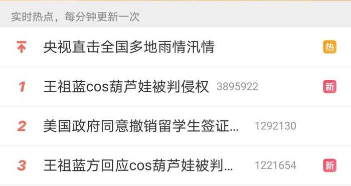 昨夜今晨,“王祖蓝cos葫芦娃被判侵权”登上新浪微博热搜第一。不过,王祖蓝工作室已于昨天夜里23时51分发布声明称,2016年王祖蓝在参加一档综艺节目时,并未以“葫芦娃”形象进行cosplay表演,网络上有关微博账号转发的配图也并非王祖蓝本人在节目中产生的演出内容,因网络配图引发的相关纠纷及争议均与其工作室和王祖蓝无关。